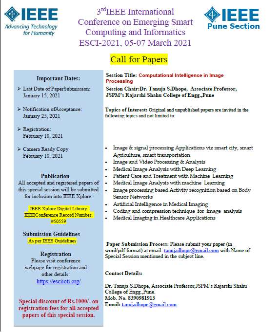 Elementor #797 Special Session 12: Computational Intelligence in Image ProcessingSession Chair :Dr. Tanuja S.Dhope, Associate Professor, JSPM’s Rajarshi Shahu College of Engg.,Pune