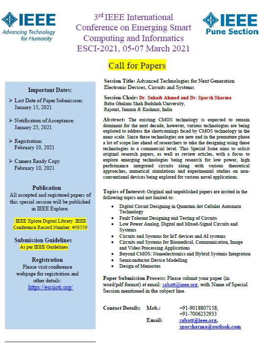 Special Session 2 Special Session 2: Advanced Technologies for Next-Generation Electronic Devices, Circuits, and Systems Session Chair: Dr. Suhaib Ahmed & Dr. Sparsh Sharma