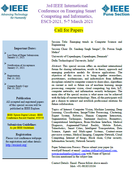 Session Chair:   1. Dr. Sandeep Singh Sengar (University of Copenhagen, Copenhagen, Denmark)